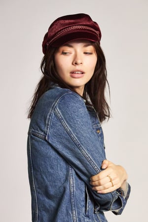 The Ashland is a cut and sew sailor cap with custom lining and a double row of cord with custom buttons on the sides by Brixton. Made in velvety burgundy red, satin lining and a trendy piece for women.